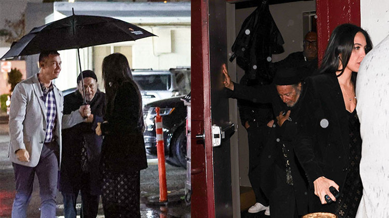 Noor Alfallah partiye uzun siyah kadife bir elbise ve bilekte botlarla gitmiş, Al Pacino da mavi pantolon ve mor bir palto giymişti, başında da şık bir fular vardı ve muhafazası usta oyuncuya yağmurdan korunması için şemsiye tutuyordu.
