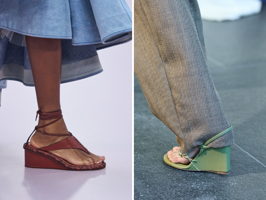 Dolgu topuk sandaletler, 90’lar referansını korurken daha rafine bir çizgiye taşınıyor. İnceltilmiş formlar, parlak deri yüzeyler ve metalik dokularla güncellenen bu modeller kesit detayları ve zarif bilek bantlarıyla daha sofistike bir görünüm sağlayabiliyor. Zimmermann, Simkhai ve Staud gibi markalarda görülen parmak arası hibritleri ve heykelsi burun detayları bu kategoriyi gündelikten çıkarıp daha çok yönlü hale getiriyor.