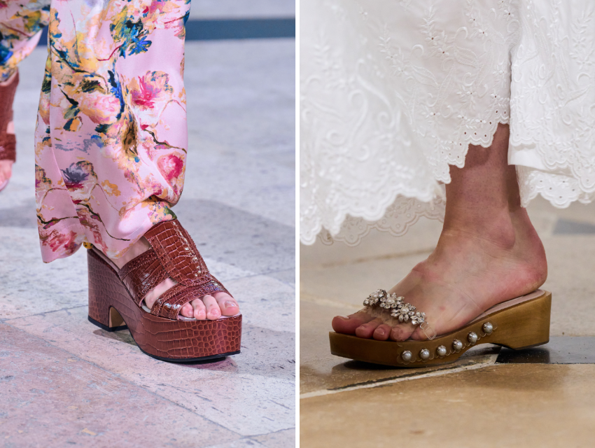 70’lerin ikonik sabo formu artık daha iddialı. Kalın tabanlar, tokalı detaylar ve süslemelerle güncellenen bu modeller, bohem maksimalizmin güçlü bir temsilcisi. Moschino’nun platform yorumları ya da Simone Rocha’nın taş işlemeli versiyonları, bu sandaletlerin yalnızca gündüz değil, daha şık görünümlerde de yer bulabileceğini gösteriyor.