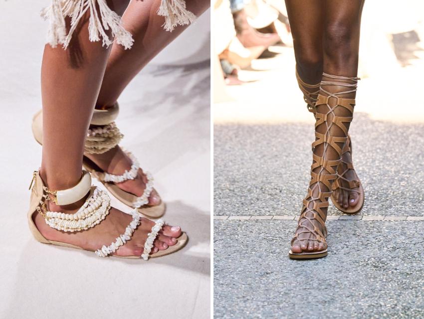 Tasarımcılar bu sezon ilhamı daha da geriye götürüyor. Antik Yunan, Roma ve Mısır etkileri, diz altına uzanan gladyatör sandaletlerden altın tonlu, yılan formunda detaylara kadar uzanıyor. Roberto Cavalli ve Khaite koleksiyonlarında görülen güçlü deri bantlar, bu estetiği modern bir dile taşıyor.