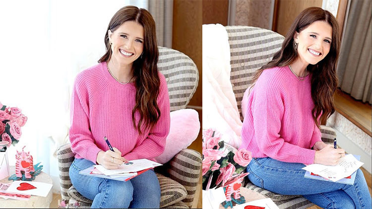 Katherine Schwarzenegger yanında pembe güller bulunan bir koltuğa oturdu, aşıklar gününe uygun pembe bir kazakla sevgilisine Sevgililer Günü kartları yazarken görüntülendi.