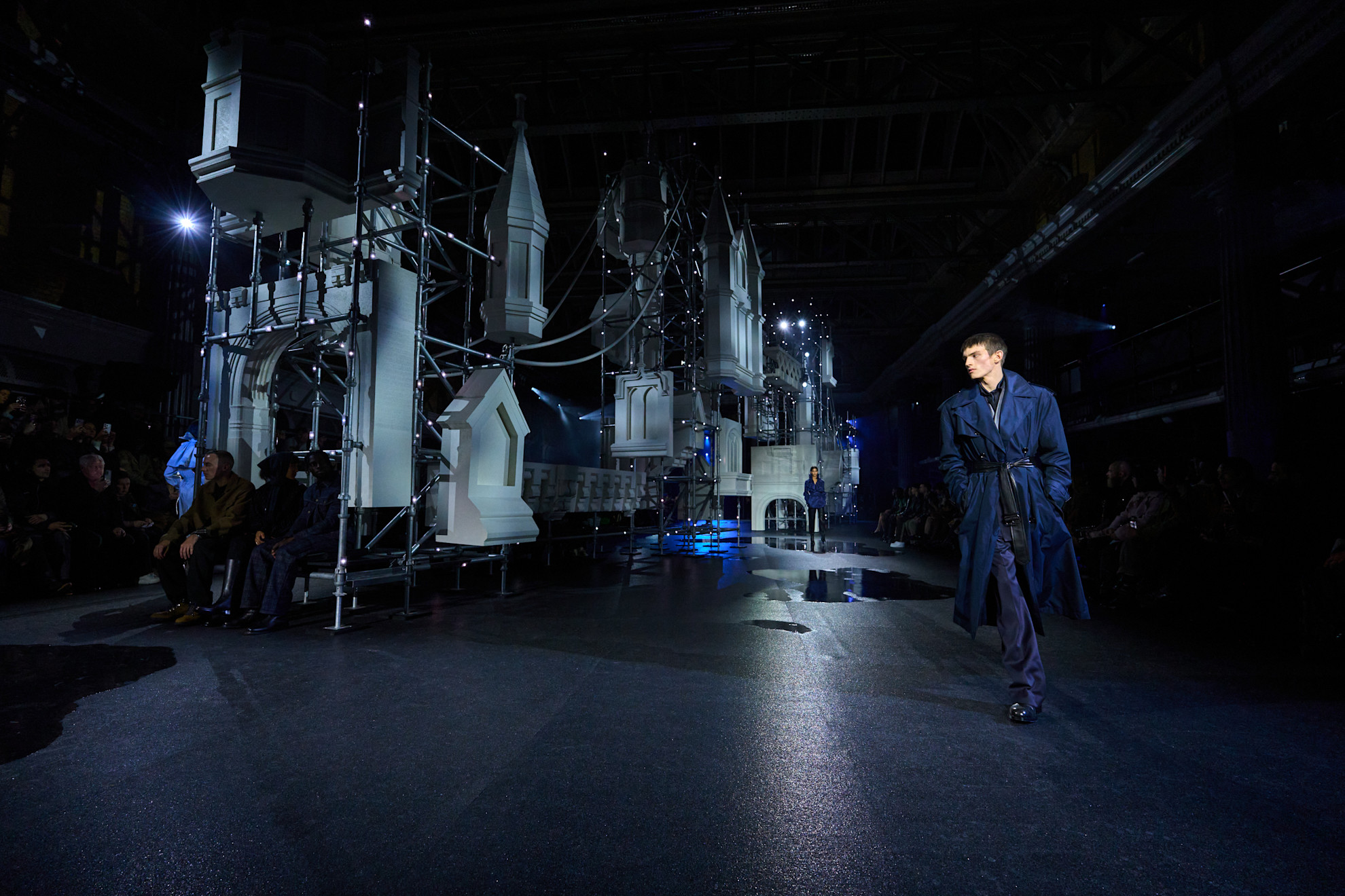 Defile, Thames kıyısındaki Old Billingsgate’te gerçekleşti. Mekanın içine kurulan Tower Bridge replikası, yanıp sönen ışıkları ve zemine yerleştirilmiş siyah “su birikintileri” ile Lee’nin kış Londra’sını teatral bir biçimde yeniden yarattı.