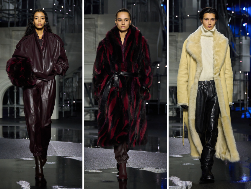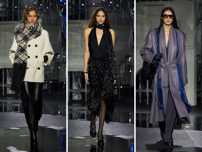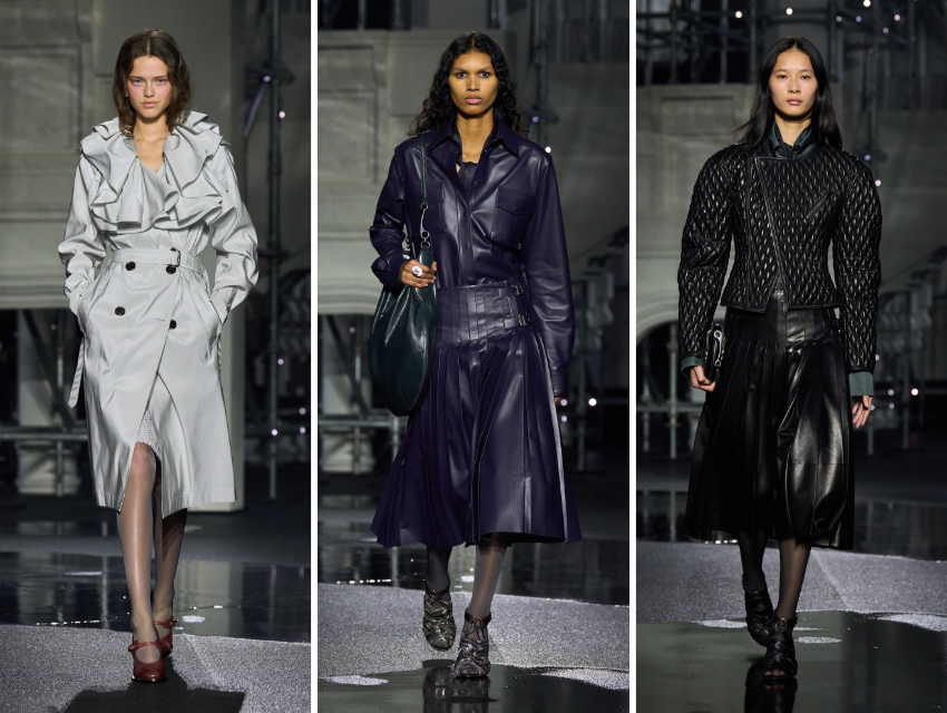 Bu sezon trençkot tek bir siluet değil, bir kategori. Fildişi, gece mavisi ve teal tonlarındaki modellerde klasik “gun flap” detayları fırfırlara dönüşüyor. Ekose, deri, ipek, patchwork shearling ve parlak siyah versiyonlar koleksiyon boyunca çeşitleniyor. Bordo tonunda tüylü shearling bir model kadar, saf beyaz yün bir trenç de var. Neredeyse hepsinde hafif oversize bir kesim ve 80’leri hatırlatan düşük omuz apoletleri dikkat çekiyor.