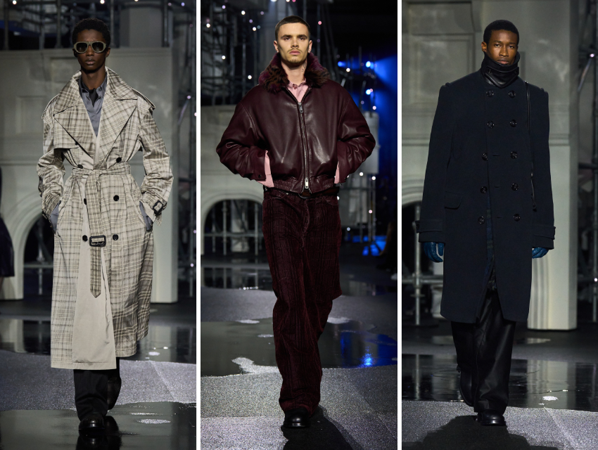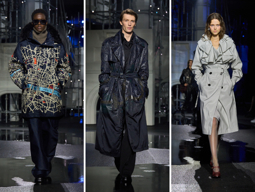Koleksiyon yalnızca trençkotlardan ibaret değil. Yumuşak deri kilt’ler, bomber ceketler ve dar eşofman altları, deri yakalı keskin yün paltolar, ayakta sağlam duran, askeri referanslı dış giyim parçaları öne çıkıyor. Parçalar gösterişli olmaktan çok işlevsel. Londra’nın gerçek hava koşulları düşünülerek tasarlanmış gibi.
