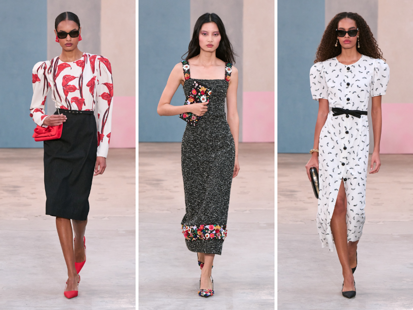 Aksesuarlar bu kontrollü gösterişi dengeledi. Fiyonk detaylı kitten heel ayakkabılar, metal çiçek aplikeli kutu çantalar ve aynı metal detayın tekrarlandığı elbiselerle görünümü tamamladı. Hayvan motifleri ve markanın ikonik Good Girl parfüm şişesinden ilham alan stiletto çizimi, gömlekler ve kalem etekler üzerinde grafik bir vurgu yarattı. Calla lily çiçekleri ise hem düğme detaylarında hem baskılarda tekrarlandı.