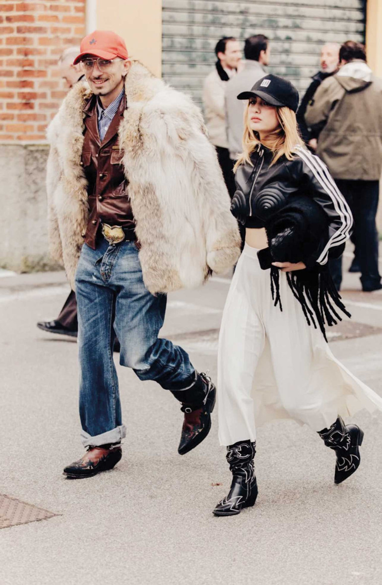 İlk dikkat çeken ayrıntı kravat. Ancak bildiğimiz manasıyla değil. Kravat sokağa inmiş durumda. Jean üstünde, trikoyla kullanılıyor, dökümlü ceketlerin altından çıkıyor. Kadronun bir modülü olmaktan öte tarz ayrıntısı haline gelmiş. Resmiyet taşımıyor, karakter katıyor. Milano’da olduğu üzere Paris sokaklarında da kravatın bu kadar rahat kullanıldığını görmek tesadüf değil. Kravat artık bir ciddiyet simgesinden çok, bir tarz göstergesi haline geldi.