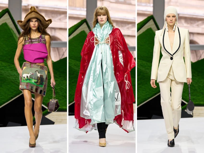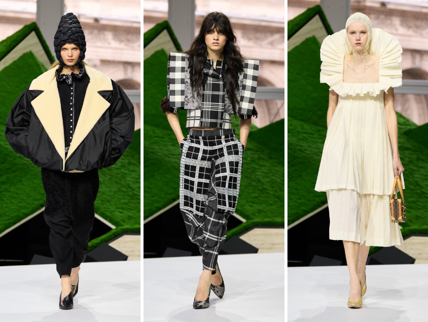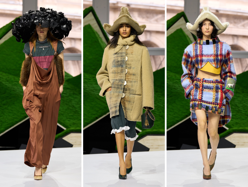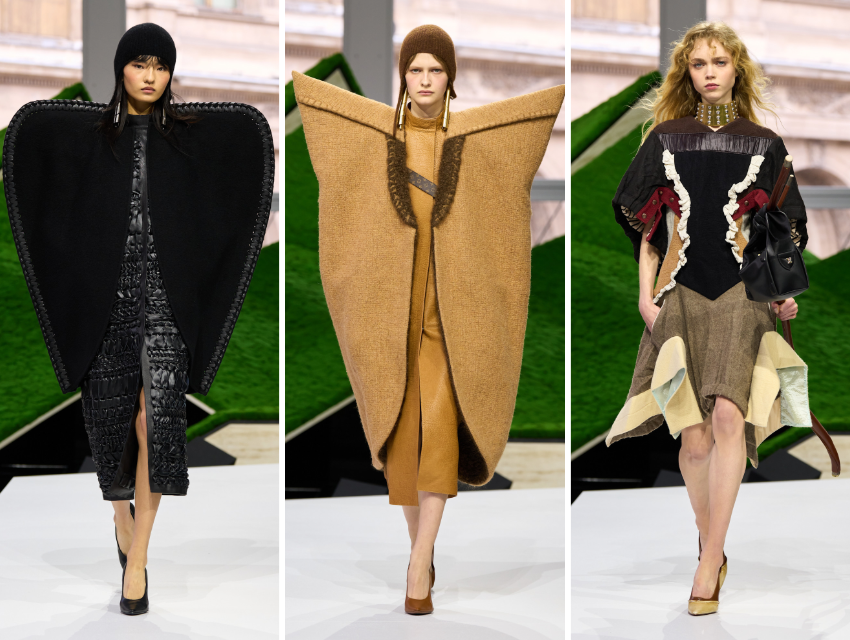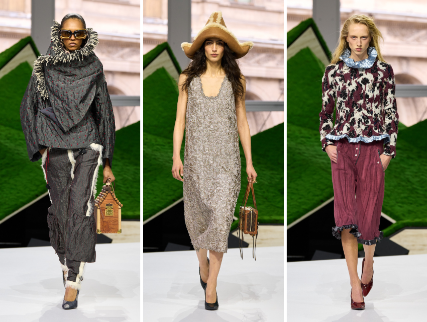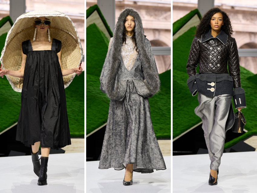 Silüetler Ghesquière’in imzasını taşıyan deneysel bir çeşitlilik sunuyordu. Uzun içlikleri andıran tulumlar, kısa deri ceketler, geniş omuzlu pelerinler ve hafif yağmurluklar koleksiyon boyunca farklı ölçeklerde bir araya geldi. Patchwork tulumlar, konik şapkalar ve sert formdaki pelerinler defilenin en dikkat çeken parçaları arasındaydı.