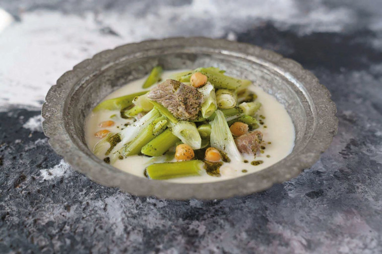 ◊ Bu sırada taze sarımsakların baş kısımlarını temizleyin, beyaza yakın kısımlarını 3-4 santim uzunluğunda doğrayıp tencereye ekleyin. Sarımsaklar yumuşayana kadar 25-30 dakika daha pişirin.