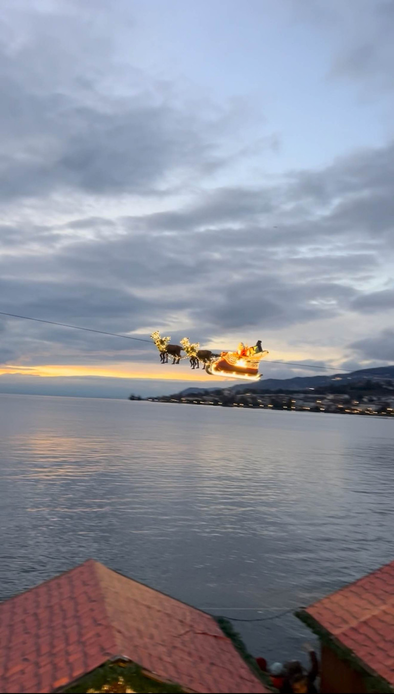 Pazarlarda dolaşıp elimizdekileri bitirdikten sonra sıra o büyülü ana geliyor: Uçan Noel Baba gösterisi. Aktifliğin yapılacağı noktaya gidiyoruz fakat evvel görüntüyü en hoş nereden izleyebileceğimizi bulmak için küçük bir keşfe çıkıyoruz. En sevdiğimiz yer Chalet Fondue oluyor. Balkonundan tüm göl, ışıklar ve sahne görülüyor. Biz talihimize yer buluyoruz lakin rezervasyon yaparsanız garanti olur.