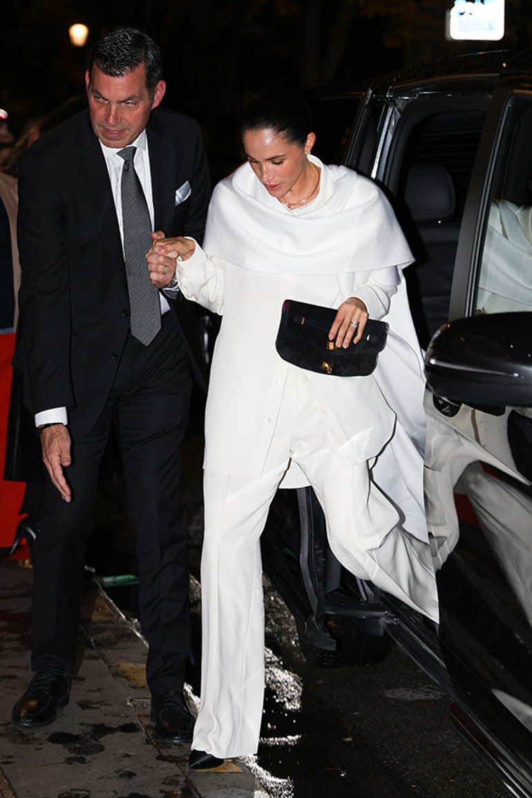 Şık ve minimalist kombinini siyah sivri burunlu topuklu ayakkabılar ve sade siyah bir el çantasıyla kombinleyen Meghan görünümünü elmas küpelerle süslemişti.